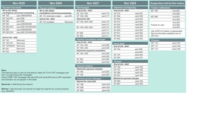 See also this Opens in a new tabStandards MT November 2025 – Standards Release Guide. (Swift account needed)